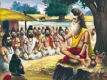 It was gradually started from the philosophical conferences held by Janaka, the king of Mithila at his court. These philosophical conferences led to the formation of a seat of learning and this seat of learning converted into the university of Mithila. It was the prominent seat of Brahmanical system of education.[1][2][3][4][5][6][7] Mithila is the seat of Maithil Brahmin. From ancient times, Maithil Brahmins had given different dimensions to the ancient Indian Philosophy. Nyaya Shastra, Tarka Shastra, Mimansa and Shankhya Shastra were mostly emerged from Mithila.[8][9] Uddalaka Aruni discovered the theory of three elements of the life. Ashtavakra taught King Janaka the metaphysical nature of existence and the meaning of individual freedom. The philosophical conversation between Ashtavakra and Janaka is recorded as ancient philosophical texts known as Ashtavakra Gita or Ashtavakra Samhita.[10] Similarly Yajnavalkya taught Brahman Vidya to the King Janaka.[11] Yajnavalkya is the author of Satapatha Brahman and is considered as the Father of Indian philosophy. Gargi Vachaknavi was a Brahmavadini. She composed several hymns in the Rig Veda that questioned the origin of all existence. She was honoured as one of the Navaratnas (nine gems) in the court of King Janaka of Mithila. She took part in the Shastrarth with Yajnavalkya, in which she asked some questions related to the foundation of the existence of the nature. Yajnavalkya answered all her questions.[12] Maitreyi was another Brahmavadini who lived during the later Vedic period in ancient India. She is mentioned in the Brihadaranyaka Upanishad as one of two wives of the Vedic sage Yajnavalkya. She was Advaita philosopher. In the Rigveda about ten hymns are attributed to Maitreyi. She explores the Hindu concept of Atman (soul or self) in a dialogue contained in the Brihadaranyaka Upanishad. The dialogue, also called the Maitreyi-Yajnavalkya dialogue, states that love is driven by a person's soul, and it discusses the nature of Atman and Brahman and their unity, the core of Advaita philosophy. She is estimated to have lived around the 8th century BCE. Aksapada Gautama founded Nyaya Shastra. Mandana Mishra (8th century CE) was a Hindu philosopher who wrote on the Mīmāṁsā and Advaita systems of thought. He was a follower of the Karma Mimamsa school of philosophy and a staunch defender of the holistic sphota doctrine of language. He was a contemporary of Adi Shankara. Maṇḍana Miśra is known to be a student of a mimamsa scholar Kumarila Bhatta, but who also wrote a work on Advaita, the Brahma-siddhi. He is best known as the author of the Brahmasiddhi. In the 9th to 10th century, Vācaspati Miśra was philosopher of Advaita Vedanta and wrote one non-commentary, Tattvabindu, or Drop of Truth, which focuses on Mīmāṃsā theories of sentence meaning. In the 14th century, Vidyapati emerged as Maithili and Sanskrit poet, composer, writer, courtier and royal priest in Mithila. He was a devotee of Shiva, but also wrote love songs and devotional Vaishnava songs. He knew Sanskrit, Prakrit, Apabhramsha, and Maithili.[13][14][15]