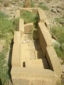 Two Burial places of the ancient graves in Wahi Pandhi are sited along both banks of Narri or Nalli hilly torrent are locally called roman’s graves. Both necropolises can be counted of different periods.[1] The awning of Smail Fakir is the sole monument of the desert of Kachho which is constructed with heavy carved pillars without any material. The Ceiling stones of the canopy are expertly engraved with gorgeous Sun-like structure.[1] The graves are built with yellowish stone blocks. It seems no any material was used for fitting stone slabs together with. Many memorial names and other inscriptions are inscribed on stones to be belied in Kufi or Persian language script.[1] It is believed that these belong to the invading period of Alexander the Great and some scholars are of the opinion that these ancient graves belong to Baloch tribe but question arises that which Baloch tribe had tradition to keep corpse in open or columned graves with carved stone slabs. Bherumal Maharchan Adwani considers the graves of Zoroastrians. In Sindh, invasion of Persia Iran can be traced from Daruish-1.[2][1] In 637 AD, during the battle of Qadisia,[3] the Muslims invaded Persia. The Zoroastrians were called Gabrs in the reflection Gabr, the Zoroastrians called themselves Behdin or Bahadin. Many Gabr or Gabar as well Givar Bands are constructed near hilly torrents for collecting waters in Kirthar Mountains Range which indicate to Zoroastrians.[1] Zoroastrians or Parsis still live in Pakistan[4] and India.[2] History reveals that Zoroastrians or Parsis migrated from Iran to Punjab, Pakistan and Sindh, Pakistan.[5]