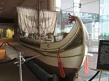 Ships and boats were an important part of the ancient Egyptian's life.[1] The earliest boats in Egypt were made during the time of the Old Kingdom where they were used along the Nile River. Because of the lack of wood, boats were made with bundled papyrus reeds. The boats were 25 meters long, two to three meters wide, and sixty centimeters deep which allowed seating for 30 rowers with one to two rudder oars. Hulls were sickle shaped and often had masts and deck houses. Over time the Egyptians tried to transport heavier loads and this brought about the desire for stronger boats. Trade and war also assisted in the desire to have stronger, sturdier vessels. The wooden vessels were similar to those made of reeds but the main difference was the eventual adoption of a single square mast that was fastened to the gunwale. After being reinforced, it was able to carry 300 ton loads up and down the Nile River.[2] These vessels, despite being reinforced, were unable to be used in the Mediterranean or Red Seas. The use of ships in Egyptian Warfare is as old as conflict in Egypt itself but there was very little ability for sea travel to be achieved. When sea travel was obtained, the vessels and the wars they were in were depicted in red on pottery of that time period.[3]