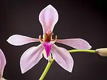 A deciduous species from a region with a very pronounced dry season, A. rothschildianus goes into a state of abscission and loses leaves before it comes into flower.[1][2][4][3] At the end or the dry season, the flowers appear from the base of the mature, leafless pseudobulb in a pubescent inflorescence. Each plant produces three to four large (8 cm across), attractive, and showy flowers are that are dusky rose pink in color with a three-lobed lip that is magenta in color and ends in an elongated, narrow, curved projection.[1][2] The flowers have a mild, spicy fragrance with a hint of a metallic odor.[1][4]
