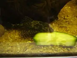 The diet of this genus is typical for a Loricariid – algae, aufwuchs, and detritus, with sediment, sand, and gravel presumably ingested accidentally alongside food items.[13][14][15][16][17][18] Despite reports among fish-keepers that they require wood in their diet, no scientific evidence to date supports members of this genus feeding on wood. Bristlenoses do not school but hide when not feeding, juveniles however are typically found in brightly lit shallows at the water margin making them susceptible to predation by birds.