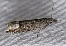 The wingspan is 11–15 mm. In Europe, there are two generations per year, with adults on wing from April to May and from July to August.
