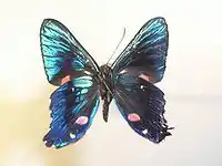 The wingspan is about 40 mm. A recent study has shown that it has patches of unusual microstructure on the ventral wing scales. This highly tilted, multilayered arrangement produces a bright iridescence of broad wavelength range and generates a strong flicker contrast from minimal wing movement.