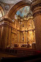 Andean Baroque (Spanish: Barroco andino or arquitectura mestiza) is an artistic movement that appeared in colonial Peru between 1680 and 1780.[1] It is located geographically between Arequipa and Lake Titicaca in what is now Peru, where rules over the highlands and spreads over the entire altiplano. From the Portuguese word barrueco meaning impure, mottled, flamboyant, daring, the most striking example of Andean Baroque art is in religious architecture, where criollo and indigenous craftsmen together gave it a unique character, as happened in the New Spanish Baroque.