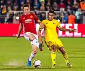 On 25 February 2016, Herrera scored his first European goal at Old Trafford – a powerfully converted penalty in the latter stages of a 5–1 defeat of FC Midtjylland, in the Round of 32 of the Europa League.[24] Later that week, on 28 February, Herrera scored the winning goal in a 3–2 victory over Arsenal.[25] On 23 April, Herrera featured in United's triumph in the FA Cup Semi-final over Everton at Wembley; on as an 87th-minute substitute for Marouane Fellaini with the score tied at 1–1, Herrera played a one-two with Anthony Martial, sending the Frenchman through on goal to score a dramatic injury-time winner to seal a 2–1 win and send United through to the final.[26] United went on to beat Crystal Palace 2–1 in the final, securing the cup and Herrera's first major honour with United.[27]