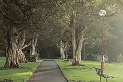 A floodlit sports field is available for cricket; various codes of football; volleyball; and other activities. There are pathways, sandstone flagging, a depression-era concrete wall and a small beach. The main path through the park is lined with Hill's weeping figs.