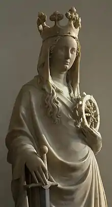 One of the projects in which Beauneveu was engaged between 1374 and 1377 was a funeral monument for the Count of Flanders, Louis of Male. The project was never finished but a statue of St Catherine that was to form part of the supporting structure survives at the Onze Lieve Vrouwkerk in Kortrijk. This lifelike figure, with her gently curving pose, naturalistic features and direct gaze, gives a clear sense of the elegance that Froissart and his contemporaries so admired in Beauneveu's work.