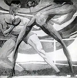 In 1914, the year of his first solo exhibition (at the Galerie Levesque in Paris), Segonzac was drafted for military service in World War I. He saw combat in the region of Nancy and at Bois-Le-Prêtre, before being transferred to the pioneering camouflage section led by Lucien-Victor Guirand de Scévola. Between 1914–1918 he published and exhibited a number of war drawings, and by war's end he had earned the Croix de Guerre. He drew on his military experiences—and learned etching in 1919—in order to illustrate The Wooden Crosses by Roland Dorgelès (published in 1921). Segonzac found etching to be a congenial medium to his spontaneous drawing style, and by the end of his life he had produced some 1600 plates.[4] His work was also part of the art competitions at the 1932 Summer Olympics and the 1948 Summer Olympics.[5]