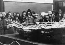 Two of the sealers in search of water, Olav Salen and Karl Tusvick, discovered Andrée's boat near a small stream, frozen under a mound of snow and full of equipment, including a boathook engraved with the words "Andrée's Polar Expedition, 1896".[41] Presented with this hook, Bratvaag's captain, Peder Eliassen, assigned the crew to search the site together with the expedition members. Among other finds, they uncovered a journal and two skeletons, identified as Andrée's and Strindberg's remains by monograms found on their clothing.[41]