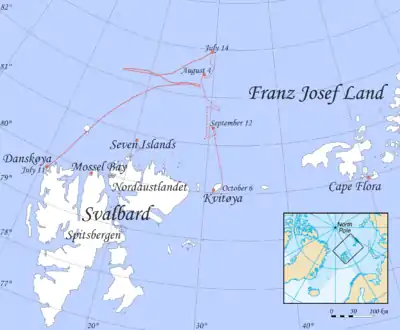 Before starting the march across the "dreadful terrain," the three men spent a week in a tent at the crash site, packing up and making decisions about what and how much to bring and where to go. The far-off North Pole was not mentioned as an option; the choice lay between two depots of food and ammunition laid down for their safety, one at Sjuøyane in Svalbard and one at Cape Flora in Franz Josef Land. Inferring from their faulty maps that the distances to each were about equal, they decided to try for the bigger depot at Cape Flora. Strindberg took more pictures during this week than he would at any later point, including 12 frames that make up a 360-degree panorama of the crash site.[36]