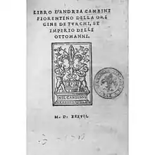 Cambini was the author of an early history of the Ottoman Empire, the Commentario de Andrea Cambini fiorentino della origine de turchi, et imperio della casa Ottomanna, which was published in 1529,[2] two years after his death in Florence in 1527.[3] By 1541, Cambini's book had been reissued several times.[4]