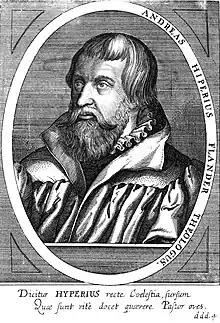 Hyperius's theology lies between Lutheran and Reformed beliefs. Influenced by Martin Bucer, he was not a strict Lutheran.[1] Jean Calvin endorsed his erudition.[3] His work De formandis concionibus sacris (On the Making of Sacred Discourses) was the first Protestant text solely devoted to systematic homiletics, that is, to preaching considered as a branch of rhetoric.[4][5] The Methodus theologiae is a selection from, and method for reading, the Church Fathers.[6]