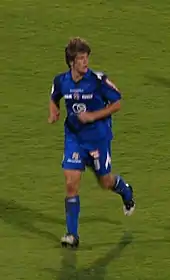 Kramarić was promoted to the first-team squad the following season. He made his first appearance of the season and also debuted in the UEFA Champions League on 15 July in an away match against Pyunik, which finished in a goalless draw.[13] Later that year, Kramarić won his first league title with Dinamo, scoring seven goals in 24 appearances en route.[14] He also made five appearances in the 2009–10 Croatian Cup and scored four goals, and made five appearances in UEFA competitions. The following season turned out to be disappointing for Kramarić, however. With the arrival of new coach Vahid Halilhodžić, Kramarić was mostly used as a late substitute, rarely being used as a match starter. He managed to collect less than 600 minutes of playing time in 17 appearances he made throughout the 2010–11 season, scoring five goals in process. Despite the personal struggle, he won the league and cup double with his team.[15]