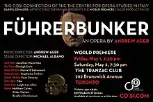 Ager's next opera "Führerbunker" had its premier in 2015 in Kitchener, as a co-production with the Waterloo Centre for German Studies.[4] The work then received several productions by COSI in Toronto.[5] This work, regarded as controversial in terms of its subject matter, is a depiction of the fall of Berlin in 1945. Described as a "morbid historical drama", the opera shows the decline and suicide of Adolf Hitler amidst the crumbling surroundings of his underground bunker, in the company of Eva Braun and the remaining staff as Berlin fell to the Soviet armed forces. Ager was advised against writing it - but he has succeeded in creating a stage work that unsympathetically shows the human end of an evil historical figure. "Führerbunker" was produced again in Ottawa in 2016 at the Mayfair Theatre, to much acclaim and discussion.