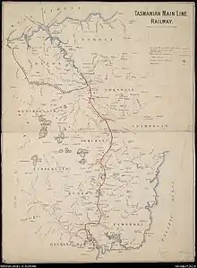 One of the major political issues addressed by Clark during his career concerned the Tasmanian Main Line Railway – a railway which connected Tasmania's two main cites, Hobart and Launceston. In 1873, the Main Line Railway Company began the construction of the line, which opened in 1876. There were a series of disputes between the Company and the government over payments due to the Company under its Deed of Concession.[11][12] Clark had spoken about the problem, advocating the acquisition of the Company by the government as early as 1878.[1] With his dual qualifications as both an engineer and a lawyer, Clark was in a unique position to understand the issues involved. As Attorney-General, he was the government's chief negotiator.