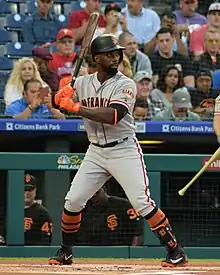 On January 15, 2018, the Pirates traded McCutchen to the San Francisco Giants, along with cash considerations, in exchange for Kyle Crick, Bryan Reynolds, and $500,000 of international bonus slot money.[73] On April 7, McCutchen had six hits in a game, going six-for-seven with four RBI against the Los Angeles Dodgers, his final hit being a three-run walk-off home run in the 14th inning.[74] Overall with the 2018 Giants, McCutchen appeared in 130 games, batting .255 with 15 home runs and 55 RBI. All of his defensive appearances were in right field.