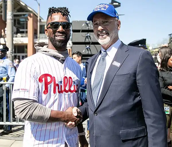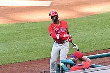 On December 12, 2018, the Philadelphia Phillies signed McCutchen to a three-year contract worth $50 million, with a $15 million club option and a $3 million buyout for 2022.[79] On June 3, 2019, McCutchen suffered a knee injury running the bases against the San Diego Padres. On June 4, an MRI revealed McCutchen had a torn ACL, and he was ruled out for the rest of the season.[80] On June 14, he had surgery to reconstruct the ACL in his left knee and to repair a medial meniscus.[81] At the time of his injury, he was batting .256/.378/.457 with 10 home runs and 29 RBI in 219 at bats, leading the NL with 43 walks, and ranked 3rd with 4.45 pitches per plate appearance and 5th with 45 runs scored.[82]