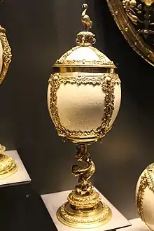 Melville received a pension from the lands of Crossraguel Abbey, and in June 1590 his servants James Boswall and David Ardeis witnessed his receipt for payment.[30] In October 1590 he made an inventory of silver plate used in the king and queen's household with Jerome Bowie, the Master of Wine Cellar. This includes two silver ships or nefs and an ostrich egg cup, described as an "ostrix eg coupe garnessit in silver dowble overgilt".[31] In 1591 he was on hand to protect the King at Holyroodhouse when he was surprised by Francis Stewart, Earl of Bothwell. Melville had a house on the north side of Holyrood close. He armed himself and entered the palace through the Abbey using a secret passage.[32]