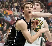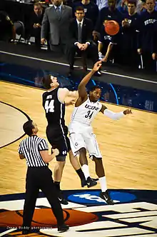 During his sophomore year, Smith played in all 38 games, starting 32.[2] After Butler got off to a mediocre 3–2 start, Smith was added to the starting lineup.[1] Against Cleveland State, he scored a career-high 22 points and collected 10 rebounds to get his first collegiate double-double. In the final game of the regular season, he played a career-high 36 minutes and recorded 11 rebounds, 3 steals, and 3 blocks, all career highs.[2] Thanks in large part to Smith's emergence as a starter, Butler returned to the NCAA Tournament.[4] During the round of 32, Smith hit a go-ahead basket with less than 3 seconds on the clock to help Butler beat top seeded Pittsburgh.[2] In Butler's sweet 16 match against Wisconsin, Smith hurt his ankle and left the game.[4] However, he returned before the game's end, collecting eight points and six rebounds as Butler advanced to the regional final.[4] Butler again advanced to the Championship game. Smith led the team in rebounding in the regional final against Florida and in the National Championship game against Connecticut.[2] He finished the year as the team's second-leading rebounder (5.6 per game) and third-leading scorer (8.5).[2][7] He made 59.3% of his field goal attempts and 67.3% of his free throws.[7]
