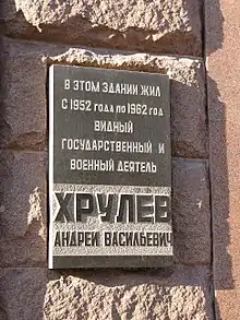 General Andrei Vasilyevich Khrulyov (Russian: Андрей Васильевич Хрулёв) (September 30 [O.S. September 18] 1892, village of Bolshaya Alexandrovka, Saint Petersburg Governorate - June 9, 1962, Moscow) was a Soviet military commander and politician.