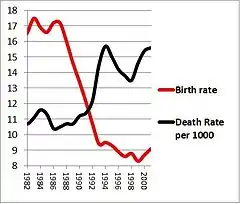 In collaboration with Daria Khaltourina he has made a significant contribution to the study of the factors of the current Russian demographic crisis. They have demonstrated that post-Soviet Russia experiences one of the world's highest prevalence of alcohol-related problems, which contributes to high mortality rates in this region. Reduction in alcohol-related problems in Russia can have strong effects on mortality decline. They have analysed the plausibility of application of general principles of alcohol policy translated in the Russian Federation. Korotayev and Khaltourina have shown that alcohol policy approaches could be implemented in the same ways as they have been in other countries, and contributed to the development of alcohol control measures in this country. In addition, according to Korotayev, there should be special attention to decreasing distilled spirits consumption, illegal alcohol production, nonbeverage alcohol consumption, and enforcement of current governmental regulations.[37] In late 2014 they correctly predicted the forthcoming return of Russia to negative natural population growth.[38]