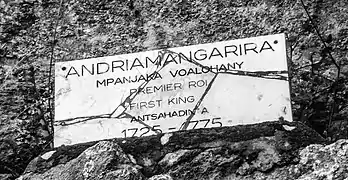 Andriamangarira was a king from the Merina Kingdom in Madagascar. He founded the royal city of Antsahadinta in around 1725. He was the grandson of King Andriamasinavalona,[1][2][3][4] son of Rasohanamanjaka of Ambohimahamanina, one of his daughters, with a certain Andriandambozozoro, Lord of Ivatobe avaratra and Malaza in Ambodirano Imerinatsimo. The tomb of Andriamangarira, qualified as a « Pirogue grave », and his « Tranomasina » (Holy house) according to traditions, are still visible in Antsahadinta.[5]
