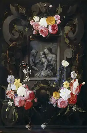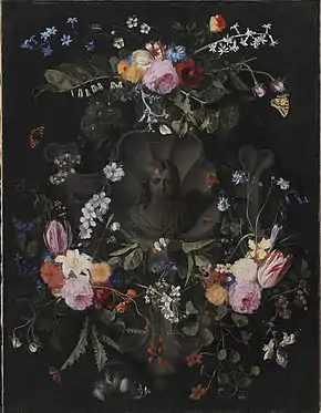 A majority of Bosman's work falls into a distinctively Flemish genre, which is referred to as 'garland painting'. Garland paintings are a special type of still life developed in early 17th century Antwerp by Daniel Seghers' master Jan Brueghel the Elder at the instigation of the Italian cardinal Federico Borromeo.[5] Other artists involved in the early development of the genre included Hendrick van Balen, Andries Daniels, Peter Paul Rubens and Daniel Seghers himself. The genre was initially connected to the visual imagery of the Counter-Reformation movement.[5] It was further inspired by the cult of veneration and devotion to Mary prevalent at the Habsburg court (then the rulers over the Southern Netherlands) and in Antwerp generally.[5][6] Garland paintings typically show a flower garland around a devotional image, portrait or other religious symbol (such as the host).[6] Garland paintings were typically collaborations between a still life specialist and a figure painter.