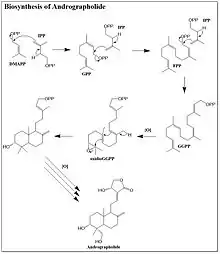 While Andrographolide is a relatively simple diterpene lactone, the biosynthesis by Andrographis paniculata was determined in the 2010s.[5][6] Andrographolide is a member of the isoprenoid family of natural products. The precursors to isoprenoid biosynthesis, isopentenyl pyrophosphate (IPP) and dimethylallyl pyrophosphate (DMAPP), can be synthesized through either the mevalonic acid pathway (MVA) or deoxyxylulose pathway (DXP).[7] Through selective C13 labeling of the precursors to both the MVA and DXP pathways, it was determined that the majority of the andrographolide precursors are synthesized through the DXP pathway.[7] There are a small portion of andrographolide precursors synthesized through the MVA pathway. The biosynthesis of andrographolide begins with the addition of IPP to DMAPP, which forms geranyl pyrophosphate. Another molecule of IPP is then added, yielding farnesyl pyrophosphate (FPP). The final IPP molecule is added to the FPP to complete the backbone of the diterpene. The double bond originating from DMAPP is oxidized to an epoxide prior to the ring closing cascade that forms two six-membered rings. A series of oxidations form a five-membered lactone in addition to adding on the alcohol groups. The order of these post-synthetic modifications is not entirely known.[7]