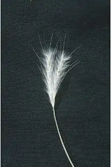 This perennial grass forms tufts of branching stems reaching 120[2] to 150[3] centimeters in maximum height. The inflorescence is made up of pairs of feathery racemes, each of which contains pairs of spikelets. Each pair is made up of one fertile spikelet and one sterile. The fertile spikelet has an awn up to 2.5 centimeters long. The spikelets are coated in very long, silvery hairs.[2][3][1] In the Great Plains, the grass blooms in August through October. In the Carolinas blooming occurs in September and October and in Louisiana the grass blooms in the fall.[2] One variety of this species, the Florida endemic var. cabanisii, has been treated as a separate species, A. cabanisii.[3][1]