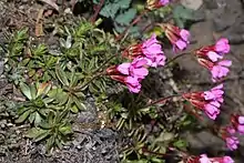 Androsace laevigata is a small mat-forming herbaceous perennial plant about 2–7 cm (0.8–2.8 in) high. The five-lobed flowers are deep pink to rose. Each lobe is 4–5 mm (0.2–0.2 in) mm long.[4][5]