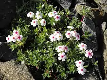 A. villosa is very variable. The typical form grown in gardens is a small tufted or mat-forming perennial, with rosettes of linear to elliptical leaves, up to 1.5 cm across. The leaves have fine hairs underneath, particularly towards the tips. The flowers, which are 6–10 mm in diameter, are in umbels on stems up to 3 cm tall. They vary in colour from white to red-purple, with a pink or yellow eye. The white forms may age to pink.[2]