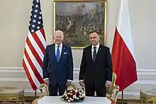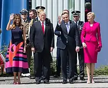 U.S. President Donald Trump praised Duda, saying: "He's doing a terrific job," and assisting him in his next Presidential campaign promises to make "American changes" throughout Poland. [64][65] In September 2019, Trump and Duda agreed to send 1,000 U.S. troops to Poland.[66]