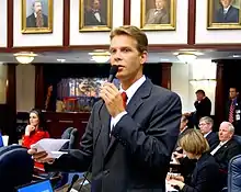 During the 2014-2016 legislative session, Gardiner serves as the President of the Florida Senate. However, in 2012, when Gardiner did not yet have the voters to be Senate President over fellow State Senator Jack Latvala, then-State Senator John E. Thrasher conspired to install himself as Senate President for the 2014-2016 term. Latvala joined with State Senators David H. Simmons and Rene Garcia to outmaneuver Thrasher, and elected Gardiner.[24] In Gardiner's term as Senate President, he pushed for state funding to provide assistance to special needs students and for the proposed expansion by the University of Central Florida into downtown Orlando, which would have included "a statewide coordinating center for disabled students as well."[25] Though both proposals were passed by the legislature, they were both ultimately vetoed by Governor Rick Scott,[26] largely seen as pushback for Gardiner's unsuccessful efforts to expand Medicaid under the Affordable Care Act.[25] Gardiner strongly condemned Governor Scott's veto of the funding for disabled students, saying, "[T]here are many families across Florida who have seen their dreams shattered by his decisions today," and noting, "It is unfortunate that the messaging strategy needed to achieve the Governor's political agenda comes at the expense of the most vulnerable people in our state."[26]