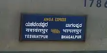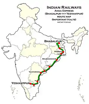 The 12253 / 12254 Anga Express is a train connecting Bhagalpur (BGP), the second largest city of Bihar, to Yeswanthpur (YPR) in Bangalore, via Munger's Jamalpur Junction, Kolkata's Dankuni station, Bhubaneswar, Visakhapatnam and Vijayawada. In February 2017, the train was provided with the new LHB coaches.[1]