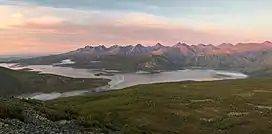The range stretches in a roughly NW/SE direction for about 100 kilometers (62 mi).[4] There are numerous rivers, waterfalls and lakes in the area. In the western part lies Lake Jack London, just beneath Pik Aborigen.[5][6]