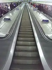 Angel is one of fourteen stations to have only escalator access to the platforms.[22] With a vertical rise of 90 feet (27 m) and a length of 200 feet (61 m), the escalators at Angel station are the longest on the Underground,[7][8] and the second longest in the United Kingdom (after one at Heathrow Terminal 5).[23]