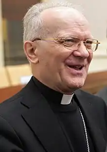 As Secretary he often served as spokesperson for the Congregation. For example, in May 2014 he acknowledged the Congreation was reviewing a complaint filed by author William Blatty against Georgetown University;[8] in January 2018, he discussed the apostolic constitution Veritatis gaudium and its restructuring of theological education;[9] and in May 2018, he discussed new norms for education in canon law with respect to marriage annulments.[10][11] He also participated in international conferences, for example in Rwanda[12] and Thailand.[13]