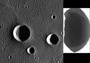 ![]() Left image shows Angelou crater at left. At right is a broadband image of the interior, shadowed part of Angelou. | |