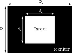 The sensed image, which includes the target, is displayed on a monitor, where it can be measured. Dimensions of the full image display and of the portion of the image that is the target are determined by inspection (measurements are typically in pixels, but can just as well be inches or cm).