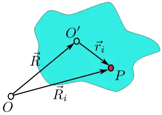 As shown in the figure on the right, the lab system's origin is at point O, the rigid body system origin is at O′ and the vector from O to O′ is R. A particle (i) in the rigid body is located at point P and the vector position of this particle is Ri in the lab frame, and at position ri in the body frame. It is seen that the position of the particle can be written: