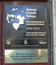 Anica Savić-Rebac (Serbian Cyrillic: Аница Савић-Ребац; 4 October 1892 — 7 October 1953) was a Serbian writer, classical philologist, translator, professor at the University of Belgrade. She wrote a number of essays and books about Njegoš, Goethe, Sophocles, Spinoza, Thomas Mann, Greek mystical philosophers, Plato, theory of literature.[1][2] She also translated a number of works from Serbian into English, most notably The Ray of the Microcosm by Petar II Petrović-Njegoš.