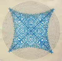 Working from her background in textile and fabric art and design, Agha uses a combination of textile processes such as embroidery, wax, dyes, and silk-screen printing within her drawings and paintings. She creates patterns based on ancient Islamic geometric patterns and Islamic interlace patterns through hand cutting, laser cutting, and sewing on paper. She uses embroidery as a drawing method to bridge the gap between modern materials and historical patterns of traditional oppression and domestic servitude. She questions the gendering of textile work as domesticated and its exclusion of it being considered an art form.[7]