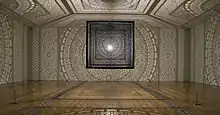 In 2013 Agha started to explore working with light and shadow, in her piece 'Intersections', a 6.5' laser-cut wood cube encasing a light bulb, she pushed the binaries of public and private, light and shadow, and static and dynamic by relying on the symmetry of geometric design and the interpretation of the cast shadows.[8] The walls of the cube showcase Moorish patterns inspired from the Alhambra,a place where Islamic and Christian worlds intersect.[9] Growing up as a girl in Pakistan, Agha was not allowed to visit the mosques because of her gender. It was from these memories of exclusion and of visiting the Alhambra that Agha started to think about all the problems that arise because of exclusion and wanted to create something that would include all, regardless of race, gender, and ethnicity.[10]