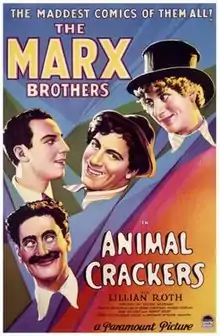 Animal Crackers is a 1930 American pre-Code Marx Brothers comedy film directed by Victor Heerman. The film stars the Marx Brothers, (Groucho, Chico, Harpo, and Zeppo), with Lillian Roth and Margaret Dumont. It was based on their broadway musical of the same name, in which mayhem and zaniness ensue when a valuable painting goes missing during a party in honor of famed African explorer Captain Jeffrey T. Spaulding. A critical and commercial success upon its initial release, it was filmed at Paramount's Astoria Studios in Astoria, Queens; it was the second of two films the Brothers would make in New York City.