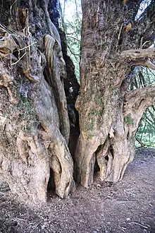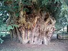The Ankerwycke Yew is an ancient yew tree close to the ruins of St Mary's Priory, the site of a Benedictine nunnery built in the 12th century, near Wraysbury in Berkshire, England. It is a male tree with a girth of 8 metres (26 ft) at 0.3 metres.[1] The tree is at least 1,400 years old,[2] and could be as old as 2,500 years.[3]