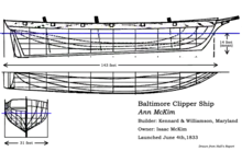 Ann McKim was a Baltimore clipper, measuring 143 feet in length, making her "easily the largest merchantman of her day...and...by far the handsomest."[2] William M. Williamson, a notable authority on sailing ships at the time, described her as "a thing of beauty."[6] She had three sail yards and royal stunsails.[15] Her square raking stern and the heavy after-drag were the common features of Baltimore clippers then. She was also distinguished by her long, easy waterlines with low freeboard and a V-shaped hull.[16] Her length-to-width ratio of over 5:1 corresponded to an extreme clipper. The bow was round in contrast with the sharp bows of the later clippers. Her bow was decorated with a figurehead in a shape of a woman. She had sloping keel—another feature that was not present in true clippers.[17] The frame was made of live oak. The hull was covered with imported red copper, adding $9,000 to her total cost.[2] (The use of copper was probably related to the fact that Isaac McKim Isaac owned a copper rolling and refining mill.[5]) The decks were of teak[18] and her rails, hatch coamings, and skylights were finished with Spanish mahogany. The finest materials used in her construction were personally selected by Captain James Curtis.[2] She also had twelve brass guns mounted on her together with brass capstan heads and bells.[8] The figurehead was design after the wife of the owner, Mrs. Ann McKim.[19]