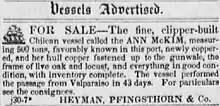 The Ann McKim was sold to Valparaiso, Chile in 1847 and sailed under the Chilean flag for five years between Valparaiso and San Francisco. Although, there are some accounts that she sailed as an Ecuadorean under Captain Van Pelt, before being registered as a Chilean vessel in December 1849.[9] She was advertised for sale in Daily Alta California[10] from January to August 1850, but evidently couldn't find a buyer and on 2 September 1851 she cleared Port of San Francisco,[11] leaving the North American waters for the very last time with Van Pelt as her captain and Orrego Bros. as owners.[12] She was mentioned once again for sale in the issue of Daily Alta California dated 18 February 1852 and later that year the Baltimore legend was dismantled at Valparaiso.[13]