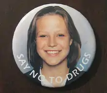 ![]() Anna Wood, depicted on a promotional badge for an anti-drugs campaign that her father organised following her death | |