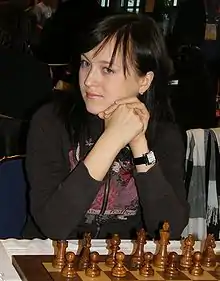 In the 'A2' section of the prestigious Aeroflot Open in Moscow 2007, she scored 5 points from the first 7 rounds, defeating three male grandmasters for a part performance rating of 2672. In January 2008, she played in the Group C of the Corus Chess Tournament in Wijk aan Zee scoring 4½/13 points.[6] Soon after, at the women's section of the Moscow Open, she took second place, behind Anna Muzychuk, and ahead of Natalia Zhukova and Kateryna Lagno.[7][8] Later that year, at the Women's European Individual Chess Championship, held in Plovdiv, she took the bronze medal, losing out 1–2 to Viktorija Čmilytė in the playoffs for silver.[9] In 2010, she won the Rector Cup in Kharkiv with a performance rating of 2649.[10]