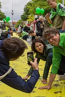 According to studies conducted by the German Marshall Fund and the Institute for Strategic Dialogue, both German and Russian state-backed sources have targeted Baerbock, spreading a large amount of disinformation, from false assumptions about the Greens to explicit sexism, such as the circulated online image featuring Baerbock's face photoshopped onto a naked female body with the caption "I was young and I needed the money".[32][33][34]